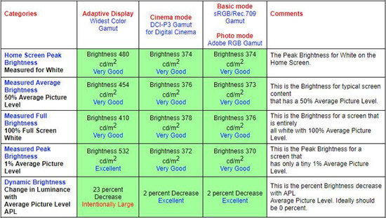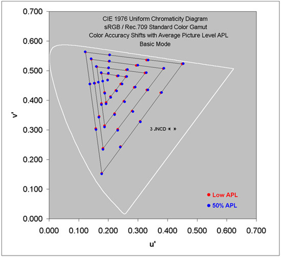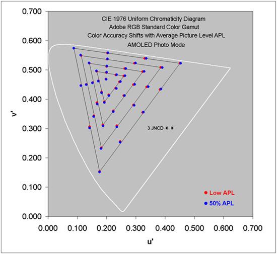 DisplayMate表示,無論那種色域模式下,隨著APL變化色差都很小,最大變化只有0.7 JNCD,最大色差也就只有1.2到1.5 JNCD之間,APL的白點(diǎn)偏移僅為0.2 JNCD,可以說是非常出色了。