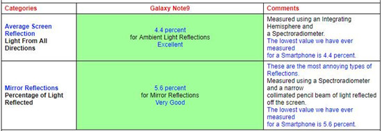 另外,在高亮環(huán)境光下,Galaxy Note 9測(cè)出的屏幕反射率也僅為4.4%,在DisplayMate測(cè)試過的智能手機(jī)中已經(jīng)是最低水平。