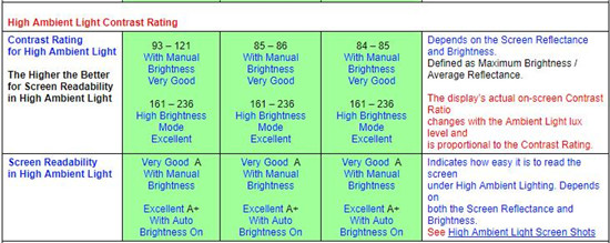 -環(huán)境光對(duì)比度評(píng)級(jí)最高(239);