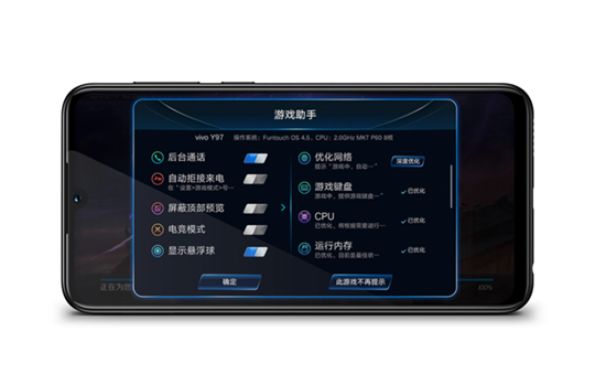大容量存儲,意味著能夠容下更多熱門游戲和應(yīng)用,而vivo Y97所搭載的聯(lián)發(fā)科P60就能夠在性能上提供相應(yīng)的支持。為了強化游戲體驗,vivo更是加入了游戲模式4.0,新增掛機模式,游戲會在息屏的狀態(tài)下繼續(xù)運行;同時新增電競模式,將王者榮耀職業(yè)選手的手機設(shè)置開放給喜愛游戲的你,更有效地調(diào)用資源,讓游戲體驗更加出色。