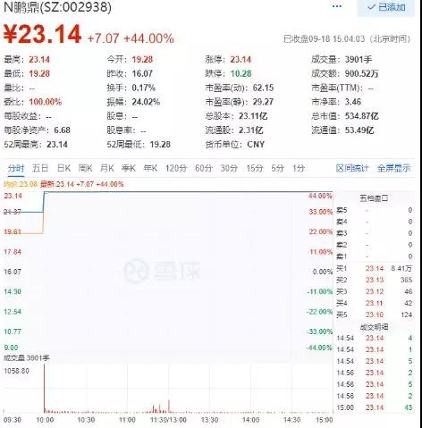 2018年9月18日,鵬鼎控股(SZ:002938)在深圳證券交易所上市。鵬鼎控股本次公開發(fā)行新股不超過23114.3082萬股,其中網下配售2311.4082萬股,網上定價發(fā)行20802.9000萬股,發(fā)行價格為16.07元/股,擬募集資金總額為37.14億元。
