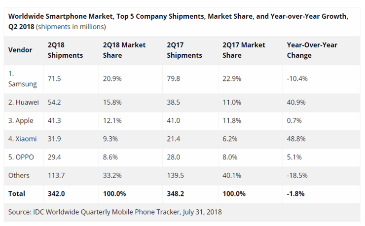 2018年7月31日,全球著名的數據調研機構IDC發(fā)布了2018年第二季度全球智能手機出貨量數據,華為第一次超越蘋果,以5420部的出貨量和40.9%的同比增長率,贏得了全球智能手機出貨量第二名。