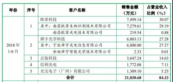 從客戶端來看,宇瞳光學(xué)客戶包括浙江大華科技有限公司、杭州??低暱萍加邢薰尽⒅貞c海岸肯呢個威視科技有限公司、杭州??低暱萍加邢薰尽⒑贾莺?低晹?shù)字技術(shù)股份有限公司、韓華泰科(天津)有限公司、HANWHA TECHWIN CO.,LTD.、YTOT KOREA CO.,LTD.、浙江宇視科技有限公司,今年上半年該公司前五大客戶占當(dāng)期銷售總額為71.23%。