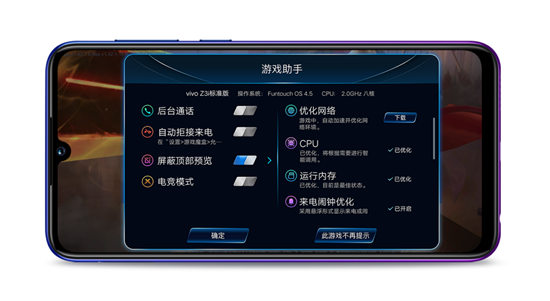 與此同時(shí),vivo Z3i標(biāo)準(zhǔn)版搭載全新游戲魔盒,充分滿足玩家需求。如增加后臺(tái)掛機(jī)和電競(jìng)模式2.0,不僅能夠做到游戲刷經(jīng)驗(yàn)、聊微信不耽誤,而且系統(tǒng)能夠?qū)⑹謾C(jī)游戲的設(shè)置調(diào)整為專業(yè)競(jìng)技狀態(tài),智能調(diào)度資源,匹配更佳的游戲環(huán)境,讓玩家更專注于游戲中,進(jìn)一步提升移動(dòng)電競(jìng)體驗(yàn)。