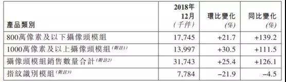 此外,2018年12月,丘鈦科技指紋識別模組出貨量達778.4萬件,同比下滑4.5%。