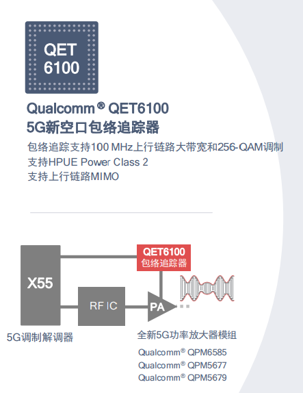 再深入點,就要說到X55配合同時發(fā)布的5G包絡(luò)追蹤解決方案了。QET6100 5G新空口包絡(luò)追蹤器能夠讓終端設(shè)備的功效翻番,在支持更高速率的同時、延長設(shè)備的電池續(xù)航時間。