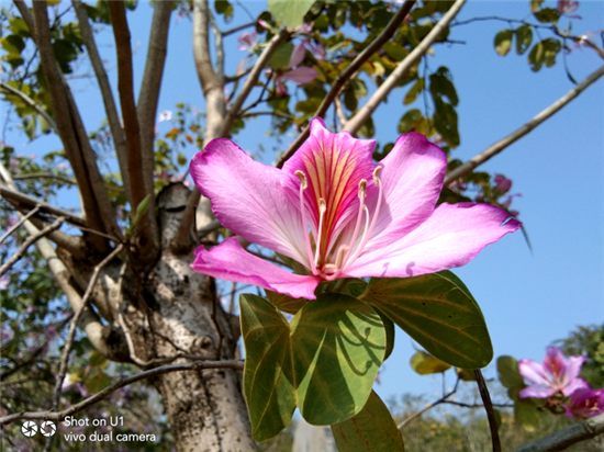 南方的春天,百花爭艷。使用vivo U1近距離對著盛開的紫荊花拍照,會自動將鮮花主體后的背景進(jìn)行虛化,從而帶來更好的成像效果。通過下面的直出樣張不難發(fā)現(xiàn),花朵鮮艷,從白色到粉紅色到深紅色的過渡自然,且色彩上也足夠飽滿,細(xì)節(jié)表現(xiàn)豐富。同時再看鮮花下面的配角“綠葉”,黃色脈絡(luò)清晰可見,兩者組合,構(gòu)成了一張吸人眼球的畫面。