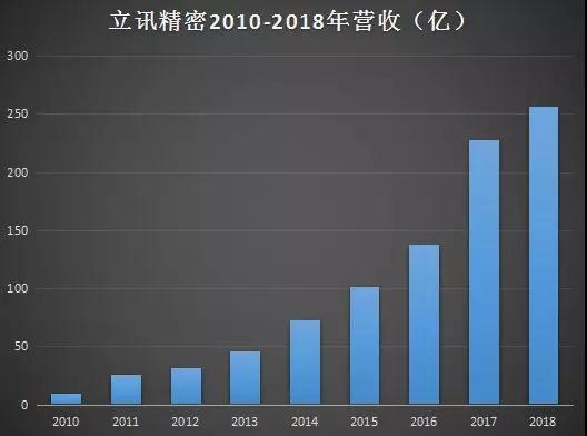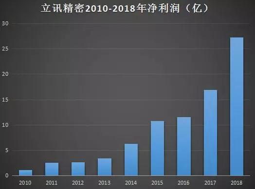 再來看看立訊精密過去8年的業(yè)績,從2010年到2018年,立訊精密營收與凈利潤從來沒有同比下降過,換而言之,在這8年中,其營收與凈利潤一直處于增長狀態(tài):其中營收從2010年的10.10億元增長到2018年的356.99億元,增長了35.6倍;而凈利潤則從1.15億元增長到2018年的27.27億元,增長了24.79倍!