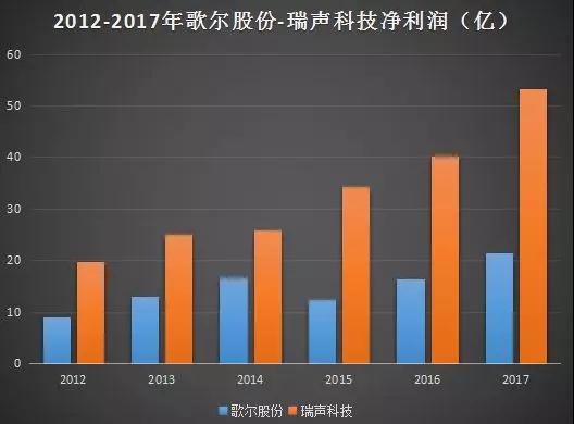 但是從凈利潤方面來看的話,歌爾股份凈利潤卻遠(yuǎn)不及瑞聲科技,2012年-2017年歌爾股份的凈利潤分別為9.07、13.06、16.57、12.51、16.51、21.39億元,相對來說,除了2015年凈利潤出現(xiàn)大幅度下降以外,其余幾年一直穩(wěn)定增長,不過,瑞聲科技凈利潤增長明顯要恐怖一些,分別為19.80、25.12、25.81、34.35、40.22、53.25億元!