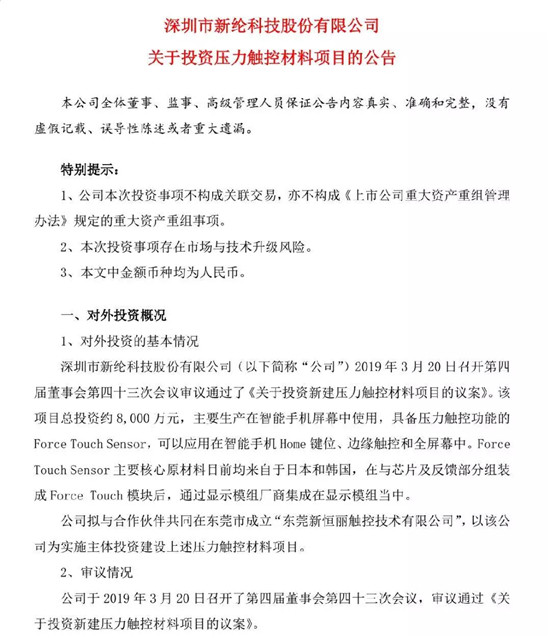 到了3月21日,新綸科技發(fā)布公告表示進軍壓力觸控領(lǐng)域!公告表示:新綸科技2019年3月20日召開第四屆董事會第四十三次會議審議通過了《關(guān)于投資新建壓力觸控材料項目的議案》。該項目總投資約8000萬元,主要生產(chǎn)在智能手機屏幕中使用,具備壓力觸控功能的Force Touch Sensor,可以應(yīng)用在智能手機Home鍵位、邊緣觸控和全屏幕中。