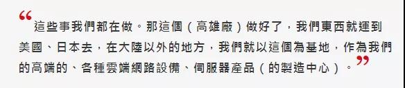 此外,“包括在天津的一個工廠,跟深圳的一部份工廠,做外銷的我們可能都會(搬回來),做內(nèi)銷的不會搬。是垂直整合的,我上一次找韓市長,就是讓他去看那個地,看完就要決定蓋廠。這些事我們都在做,高雄廠做好了,我們東西就運到美國、日本去,在大陸以外的地方,我們就以這個為基地,作為我們的高端的、各種云端網(wǎng)路設(shè)備、伺服器產(chǎn)品的制造中心。”