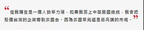 據(jù)郭臺銘這接受《天下雜志》采訪時表示,“現(xiàn)在臺灣臺商回流,我必須要講,是個平庸式的回流。從經(jīng)濟學(xué)上叫比較利益。就是今天我回來,有沒有比較好、比較便宜?但要是我今天當(dāng)選了,因為我已經(jīng)不是一個公司董事長,我是整個臺灣的總統(tǒng),也就是臺灣科技島董事長。”