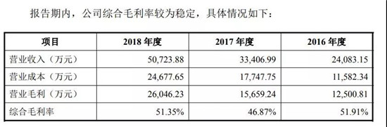 而在毛利率上,報(bào)告期內(nèi),盛視科技綜合毛利率分別為51.91%、46.87%和51.35%,而雖然2017年毛利率略有下降,但2016年和2018年毛利率穩(wěn)定。