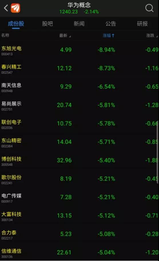 此外,A股華為概念股也出現(xiàn)大面積股價(jià)下跌的現(xiàn)象,62家華為概念成分股中有53家企業(yè)下跌。在華為概念股中,東旭光電領(lǐng)跌8.94%,春興精工下跌幅度也達(dá)到了8.73%,領(lǐng)益智造下跌8.48%,再如聯(lián)創(chuàng)電子、東山精密、歌爾股份、大富科技、合力泰、信維通信等跌幅都這5%以上。港股華為供應(yīng)商中:丘鈦科技下跌15.77%,比亞迪電子下跌11.76%,舜宇光學(xué)下跌10.41%。