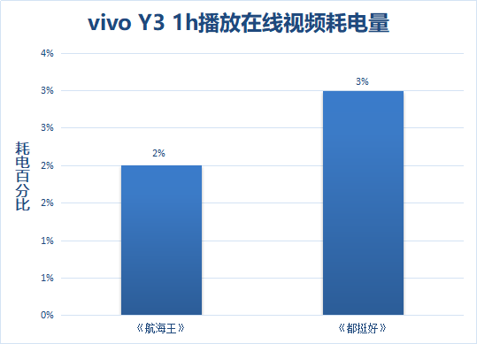 測試結(jié)果顯示,vivo Y3播放《航海王》消耗2%;播放《都挺好》消耗3%,整體消耗5%。這樣的成績對于一塊6.35英寸的水滴大屏來說實屬難得,從側(cè)面也可以反映出vivo Y3的5000mAh大電池與AI省電技術(shù)的作用。縱觀整體中端市場,vivo Y3的視頻播放表現(xiàn)穩(wěn)居第一梯隊位置。