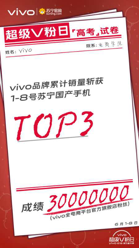 vivo的驕人戰(zhàn)績(jī)不僅體現(xiàn)在超級(jí)V粉日當(dāng)天。在6月1-8日期間,vivo在各大電商平臺(tái)也可謂全面花開,展現(xiàn)出強(qiáng)勢(shì)品牌拉力。在蘇寧易購(gòu)平臺(tái),vivo品牌累計(jì)銷量斬獲1-8日國(guó)產(chǎn)手機(jī)TOP3。