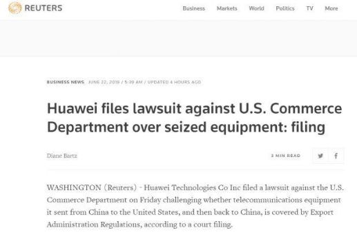 綜合路透社、彭博社與《政治》(Politico)網(wǎng)站6月22日?qǐng)?bào)道,華為在前一天正式向華盛頓聯(lián)邦法院起訴美國(guó)商務(wù)部,質(zhì)疑其在從美國(guó)返回中國(guó)途中被扣押的電信設(shè)備是否在美國(guó)《出口管制條例》(EAR)的范圍內(nèi)。
