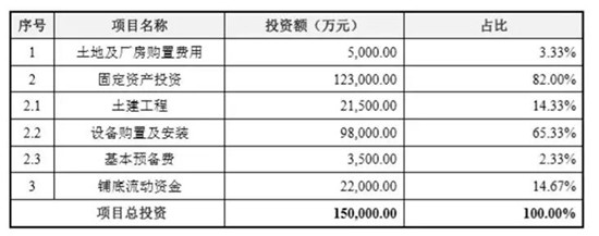 黃石信博項(xiàng)目選址于湖北省黃石市經(jīng)濟(jì)技術(shù)開(kāi)發(fā)區(qū),項(xiàng)目占地面積為139.95畝。總投資150,000萬(wàn)元,包括土地及廠房購(gòu)置費(fèi)用5,000萬(wàn)元;土建工程費(fèi)用21,500萬(wàn)元;設(shè)備購(gòu)置及安裝費(fèi)用98,000萬(wàn)元,基本預(yù)備費(fèi)3,500萬(wàn)元;鋪底流動(dòng)資金22,000萬(wàn)元。具體明細(xì)如下:
