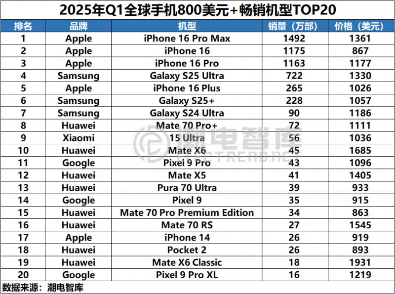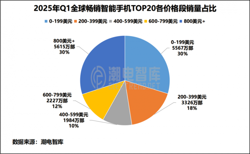 高端市場:800美元+以上全球暢銷手機TOP20總銷量為5615萬部,同比2024年Q1的6410萬部,下降12%,占比30%。