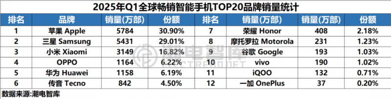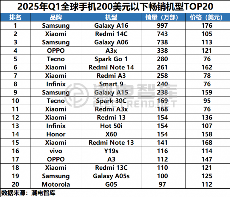 2025年Q1全球暢銷智能手機400-599美元暢銷機型TOP20總計出貨量1984萬部,9個品牌入圍(中國品牌6個,小米XiaoMi、華為HuaWei、OPPO、vivo、榮耀Honor、一加Oneplus)。