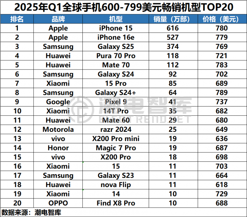 在600-799美元價格段暢銷機型TOP20中,蘋果Apple以iPhone 15和iPhone 16e兩款機型超過五百萬臺霸榜前列,值得注意的是本價格端銷量總計2227萬部,作為中高端市場,高端旗艦機型單一機型銷量差距較大。