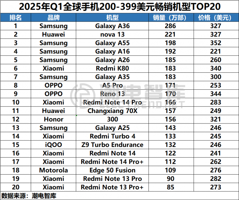 2025年Q1全球暢銷智能手機200-399美元暢銷機型TOP20總計出貨量3196萬部。三星6款機型合計出貨1372萬部,在此價格段排名第一,小米入圍7款機型,以921萬部銷量尾隨其后。華為nova13憑借221萬部銷量位列榜單第二。