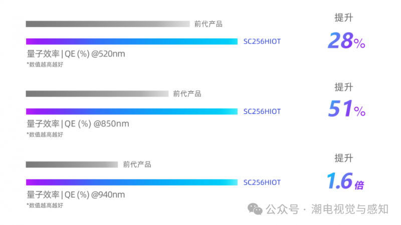 與前代產(chǎn)品相比,SC256HIOT在520nm波段下的峰值量子效率(peak QE)顯著提升約28%,在850nm波段和940nm波段下的峰值量子效率(peak QE)分別提升約51%1.6倍,同時其讀取噪聲(RN)低至0.64e-,能夠在極低照度的場景中為IoT攝像頭捕獲到清晰明亮、細(xì)膩干凈的影像。并且,得益于SC256HIOT出色的暗光成像能力,搭載該產(chǎn)品的門鈴攝像頭紅外燈打開時間可顯著減少,能夠有效降低攝像頭的運行功耗和拍攝發(fā)熱。