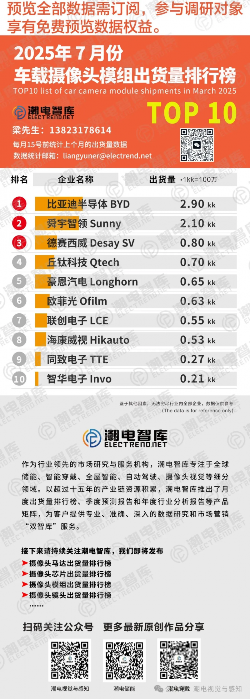 據(jù)潮電智庫數(shù)據(jù)調(diào)研,2025年7月車載攝像頭模組出貨量TOP10總量為9.34KK,其中比亞迪半導(dǎo)體以2.9KK位列榜首,在天神之眼系統(tǒng)發(fā)布后,潮電智庫就對此市場表達過預(yù)測,因為比亞迪終端的支持,比亞迪半導(dǎo)體將會長時間霸占光學(xué)攝像頭模組出貨量榜首。