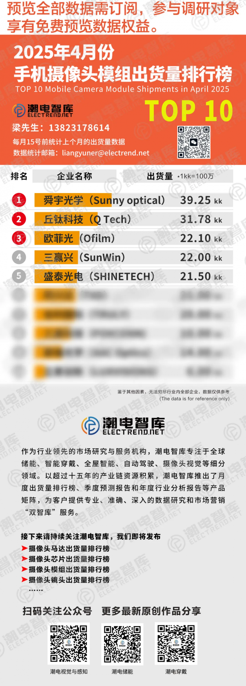 2025年4月手機攝像頭模組出貨量TOP 5,二三線工廠不停歇