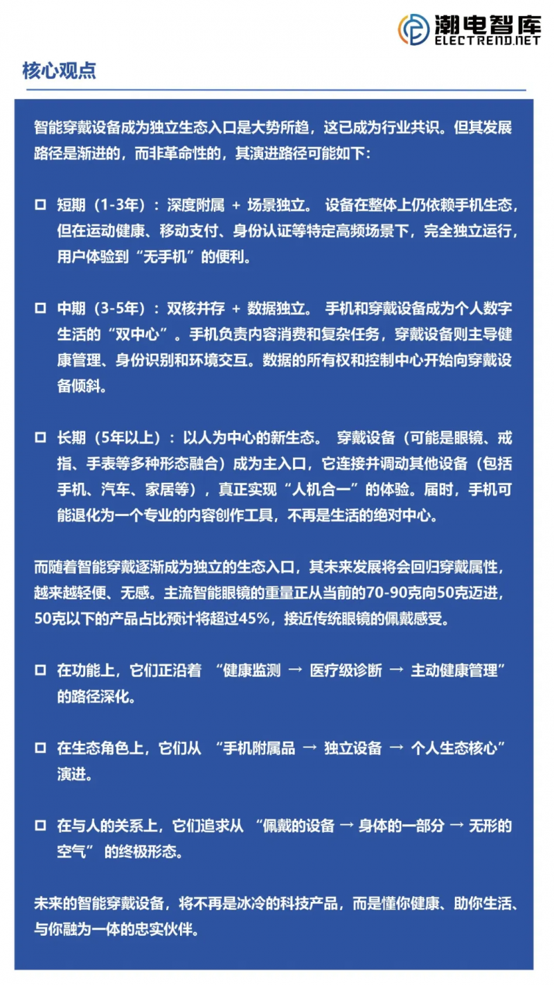 智能穿戴設(shè)備成為獨(dú)立生態(tài)入口是大勢(shì)所趨,這已成為行業(yè)共識(shí)。但其發(fā)展路徑是漸進(jìn)的,而非革命性的,其演進(jìn)路徑可分為短期(1-3年)、中期(3-5年)、長(zhǎng)期(5年以上)。而隨著智能穿戴逐漸成為獨(dú)立的生態(tài)入口,其未來(lái)發(fā)展將會(huì)回歸穿戴屬性,越來(lái)越輕便、無(wú)感。未來(lái)的智能穿戴設(shè)備,將不再是冰冷的科技產(chǎn)品,而是懂你健康、助你生活、與你融為一體的忠實(shí)伙伴。