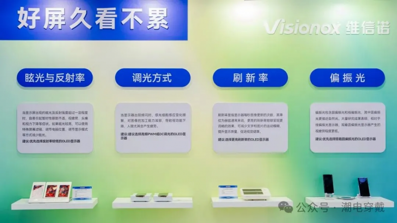 用眼健康是消費者普遍關心的問題,維信諾擁有行業(yè)最全、最領先的調(diào)光方案及系列護眼方案。現(xiàn)場,維信諾展示了全球領先的4320Hz超高頻PWM調(diào)光、全DC調(diào)光、全球首款低反射COE柔性AMOLED技術以及圓偏振光等護眼好技術。此外,維信諾還帶來系列低功耗、高畫質(zhì)創(chuàng)新技術,包括全球首款LTPS 20Hz手機低刷解決方案、高效率pTSF器件柔性AMOLED解決方案、全氧化物柔性AMOLED技術等。