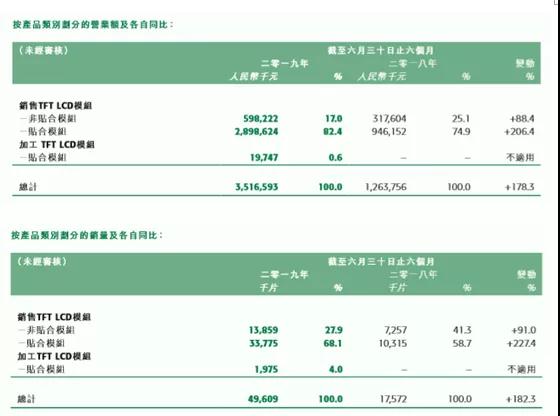 2019年9月3日華顯光電(HK:00334)發(fā)布了今年的中期報(bào)告,內(nèi)容顯示受惠于大客戶對訂單的需求提升,上半年華顯光電銷售量達(dá)4960萬片,同比上升182.3%。報(bào)告期內(nèi)營業(yè)額達(dá)人民幣35.2億元,同比上升178.3%;其中貼合LCD模塊產(chǎn)品(不包括加工LCD模塊)營業(yè)額為人民幣29.0億元,同比上升206.4%,非貼合LCD模塊產(chǎn)品營業(yè)額為人民幣5.98億元,同比上升88.4%。報(bào)告期內(nèi)部分產(chǎn)品的原材料由客戶直接提供,故該等原材料成本并未反映于相關(guān)產(chǎn)品的銷售價(jià)格內(nèi),導(dǎo)致銷售價(jià)格下降。然而,由于產(chǎn)品組合改善,整體平均銷售價(jià)格同比上升2.1%至人民幣73.4元(不包括加工LCD模塊)。