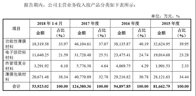 主要產(chǎn)品包括功能性薄膜材料、電子級(jí)膠粘材料、熱管理復(fù)合材料和薄膜包裝材料四大類(lèi)。其中,功能性薄膜材料、電子級(jí)膠粘材料和熱管理復(fù)合材料。產(chǎn)品主要應(yīng)用于消費(fèi)電子產(chǎn)品內(nèi)外部電子器件相關(guān)功能的實(shí)現(xiàn),如智能手機(jī)、平板電腦、筆記本電腦、智能手環(huán)等使用的保護(hù)、固定、電磁屏蔽、電氣絕緣、熱量管理等功能性材料,以及智能手機(jī)等產(chǎn)品的觸摸屏使用的防靜電、防眩光、防指紋保護(hù)膜等材料。目前已有產(chǎn)品規(guī)模化應(yīng)用于新能源汽車(chē)鋰電池組件,以實(shí)現(xiàn)絕緣、阻燃、結(jié)構(gòu)固定等功能。薄膜包裝材料產(chǎn)品主要應(yīng)用于商業(yè)包裝領(lǐng)域,以滿(mǎn)足食品、輕紡等行業(yè)的商業(yè)包裝需求。