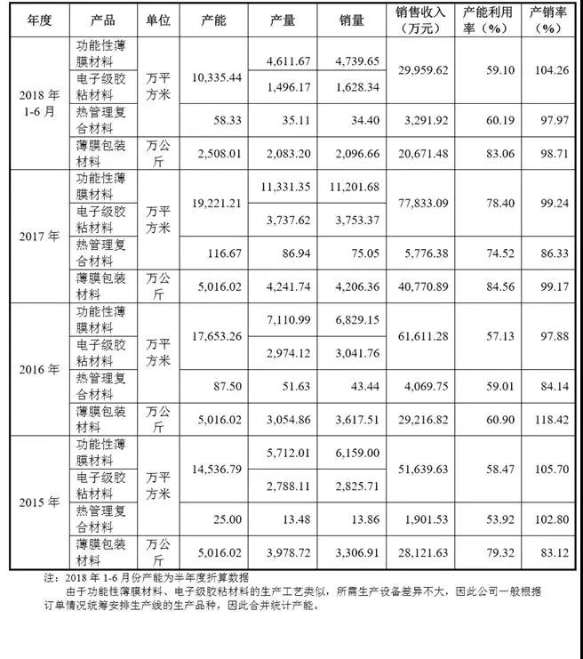 斯迪克主要為手機(jī)平板提供保護(hù)膜、OCA光學(xué)膠帶及其它組裝與功能雙面膠帶、散熱膜片、包裝膠帶等模切原材料。報(bào)告期內(nèi),公司各產(chǎn)品的產(chǎn)能及產(chǎn)銷(xiāo)情況如下: