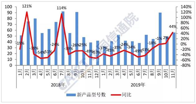 2019年11月,上市新機(jī)型56款,同比增長43.6%,其中2G手機(jī)21款、4G手機(jī)31款、5G手機(jī)4款。