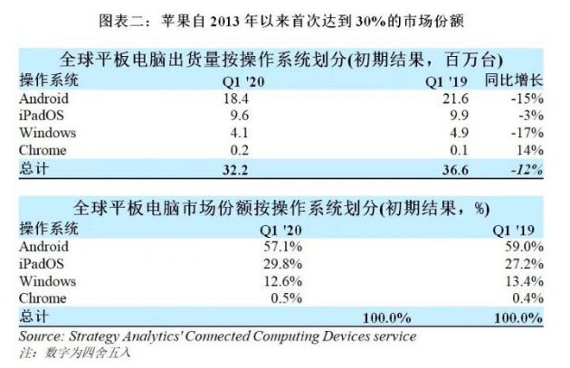 SA:2020年第一季度全球平板電腦出貨量同比僅下降12%