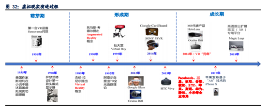 VR的概念最早源自1935年一位美國作家在小說中描述的虛擬現(xiàn)實功能眼鏡。1956年第一臺VR設(shè)備Sensorama問世,1968年薩瑟蘭德設(shè)計第一款頭戴式顯示器。1989年,杰倫•拉尼爾正式提出虛擬現(xiàn)實(VirtualReality)這個概念,隨后第二年托馬斯•考德爾提出增強現(xiàn)實(AugmentedReality)的概念。之后,1995-2015年,最老式的一批VR設(shè)備開始問世,任天堂、谷歌、Oculus、索尼、HTC先后發(fā)布了自己的VR硬件設(shè)備。2016年是VR產(chǎn)業(yè)發(fā)展元年,MR代表產(chǎn)品HoloLens和OculusRift問世,并且國內(nèi)外大型互聯(lián)網(wǎng)科技企業(yè)如Facebook、三星、索尼、谷歌、微軟、HTC、蘋果、高通、華為、騰訊、小米等紛紛布局。2017年蘋果發(fā)布基于AR技術(shù)的iPhoneX。