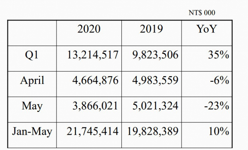 1月至5月總體營收217.45億新臺幣,去年則為198.28億新臺幣,同比上漲10%,但這個增長沒有什么意義,因為下半年市場未知。
