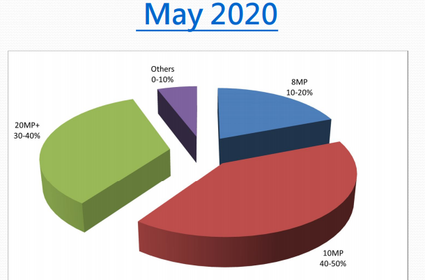 在像素鏡頭出貨量方面,5月1K-2K萬像素鏡頭整體占比80%,相比一季度1K-2K萬像素鏡頭總出貨量70%有所上升,筆者認(rèn)為,這與智能手機攝像頭朝高像素發(fā)展有關(guān)。
