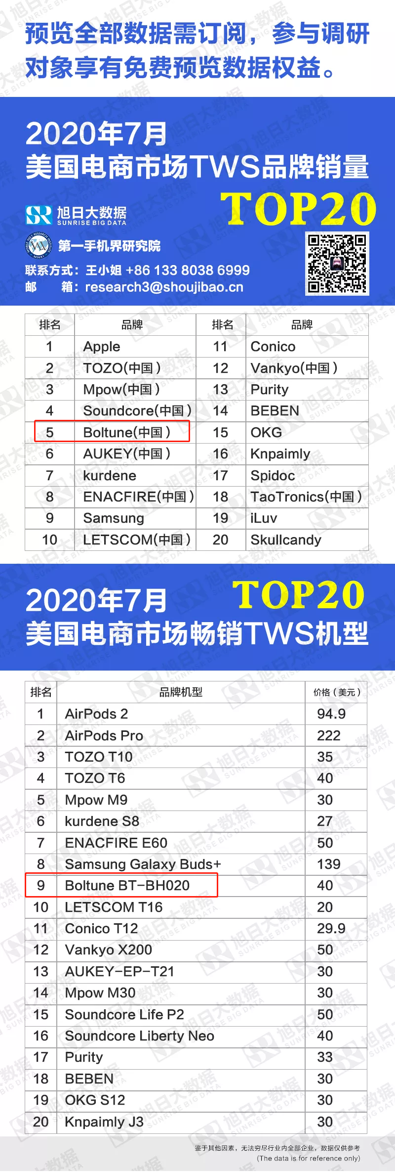 旭日大數(shù)據(jù)調(diào)研統(tǒng)計(jì)的7月歐洲電商市場(chǎng)TWS品牌銷量排行榜TOP20中,澤寶Boltune位列第15名;歐洲電商市場(chǎng)暢銷TWS機(jī)型排行榜TOP20中,Boltune BT-BH021位列第14名。