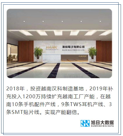 ·2018年,投資越南漢科制造基地,2019年補(bǔ)充投入1200萬持續(xù)擴(kuò)充越南工廠產(chǎn)能,在越南10條手機(jī)配件產(chǎn)線,9條TWS耳機(jī)產(chǎn)線、3條SMT貼片線。實現(xiàn)產(chǎn)能翻倍。