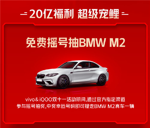 在vivo iQOO整個(gè)雙十一促銷開門紅活動(dòng)中,免費(fèi)搖號抽BMW M2是重頭戲:在2020年10月27日18點(diǎn)到2020年11月11日10點(diǎn)期間,用戶均可登陸vivo官網(wǎng)、vivo天貓旗艦店、vivo京東自營旗艦店、vivo蘇寧自營旗艦店,會(huì)員進(jìn)入活動(dòng)頁面獲取個(gè)人專屬幸運(yùn)號碼。最終中獎(jiǎng)的號碼將于11月11日16點(diǎn)在活動(dòng)頁面公證開出,獲獎(jiǎng)用戶將免費(fèi)獲贈(zèng)BMW M2真車一輛。