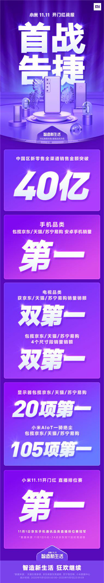 主打“智造新生活”,發(fā)放10億補(bǔ)貼,今年小米雙十一不僅在手機(jī)和電視兩大品類保持傲人成績,小米AIoT一騎絕塵!斬獲京東、天貓、蘇寧易購三平臺105項(xiàng)第一。