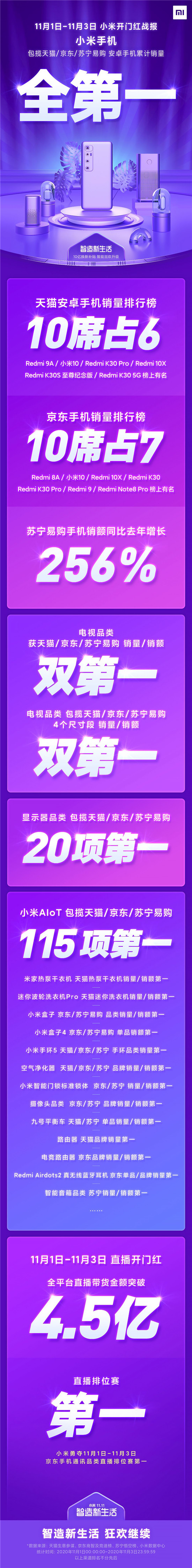 據(jù)小米官方數(shù)據(jù)顯示,11月1日至3日,小米全平臺(tái)直播帶貨金額突破4.5億元,不僅拿下京東手機(jī)通訊品類直播排位賽第一名。