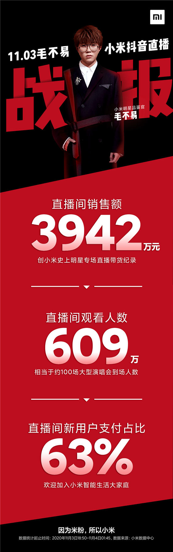 據(jù)小米官方數(shù)據(jù)顯示,11月1日至3日,小米全平臺(tái)直播帶貨金額突破4.5億元,不僅拿下京東手機(jī)通訊品類直播排位賽第一名。同時(shí)11月3日,毛不易空降小米抖音直播間,直播間銷售額3942萬元,創(chuàng)造小米史上明星專場直播帶貨記錄。直播期觀看人數(shù)達(dá)609萬,相當(dāng)于約100場大型演唱會(huì)大廠人數(shù),新用戶支付占比也高達(dá)63%。雙十一活動(dòng)還在持續(xù),相信小米的超大杯直播還將帶來更多驚喜和福利。