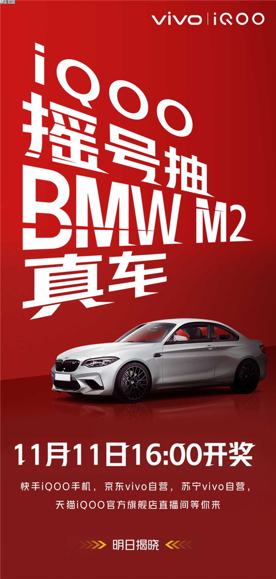 截止到11月11日上午10點,用戶可登陸vivo官網(wǎng)、vivo天貓旗艦店、vivo京東自營旗艦店、vivo蘇寧自營旗艦店,會員進入活動頁面獲取個人專屬幸運號碼。最終中獎的號碼將于11月11日16點在活動頁面公證開出,獲獎用戶將免費獲贈BMW M2真車一輛,快手iQOO手機、京東vivo自營、蘇寧vivo自營、天貓iQOO官方旗艦店直播間等你來見證。搖號活動即將結(jié)束,抓緊最后時刻趕上末班車,BMW M2真車說不定就是你的了。