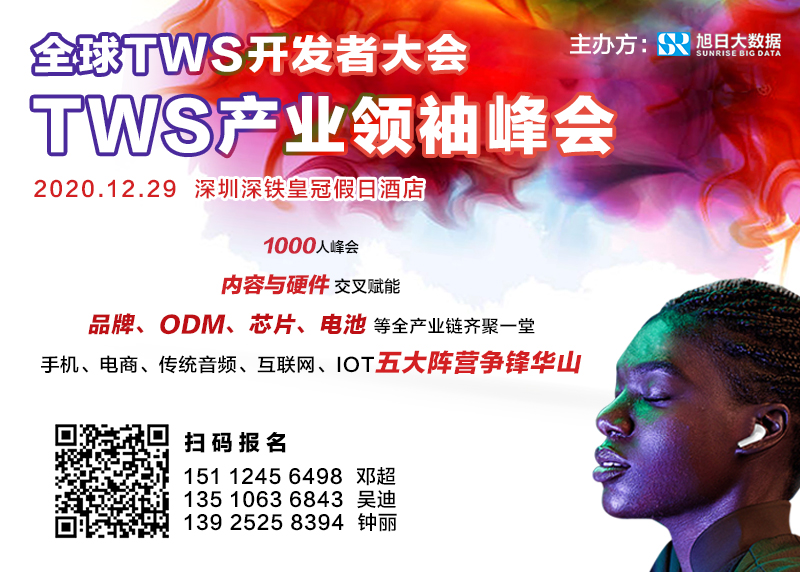 2020年全球TWS出貨量將達4.2億對,2021年將增長至6.7億對,2022將突破10億對大關(guān),成為繼手機產(chǎn)品之后,全球銷量第二大消費電子產(chǎn)品。供應鏈到終端:藍牙芯片、品牌終端、ODM、電池、硅麥、喇叭、功能芯片和內(nèi)容、外殼等廠商將會有哪些黑馬奔騰而出成為TWS產(chǎn)業(yè)的行業(yè)領(lǐng)袖?讓我們用時間和成績拭目以待。旭日大數(shù)據(jù)將于12月29號在深圳舉辦:全球TWS產(chǎn)業(yè)領(lǐng)袖峰會。邀請產(chǎn)業(yè)界朋友參加,見證行業(yè)發(fā)展,做大做強,共創(chuàng)輝煌。