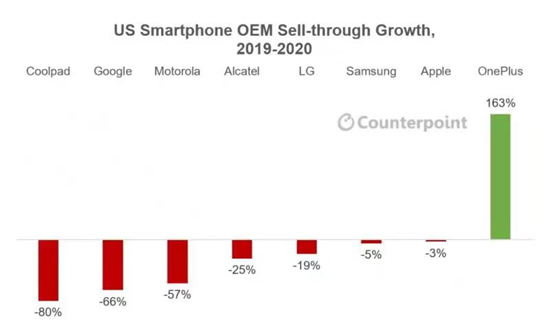 2021年2月3日,全球權(quán)威調(diào)研機(jī)構(gòu)Counterpoint發(fā)布2020年美國(guó)智能手機(jī)市場(chǎng)年度報(bào)告。報(bào)告顯示,2020年整體智能手機(jī)市場(chǎng)同比下降15%,美國(guó)市場(chǎng)幾乎所有手機(jī)品牌都出現(xiàn)了負(fù)增長(zhǎng),直到下半年才出現(xiàn)復(fù)蘇的跡象。在此大背景之下,一加成為2020年度美國(guó)手機(jī)市場(chǎng)唯一逆勢(shì)增長(zhǎng)品牌,年增幅達(dá)到163%。