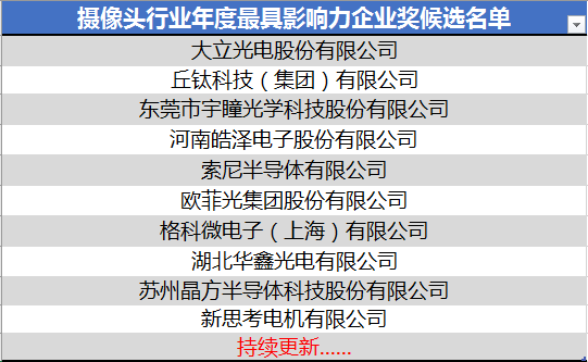 2月23日,2020年攝像頭行業(yè)最具影響力企業(yè)獎(jiǎng)候選名單正式公布。如下圖所示: