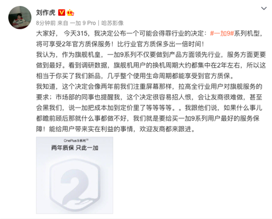 一加創(chuàng)始人兼CEO劉作虎稱“作為旗艦機皇,一加9系列不僅要做到產(chǎn)品方面領(lǐng)先行業(yè),服務(wù)方面也要做到最好。調(diào)研數(shù)據(jù)顯示,旗艦機用戶的換機周期都集中在2年左右,所以這相當(dāng)于你買了一加9,幾乎整個使用生命周期,都能享受到官方質(zhì)保。”